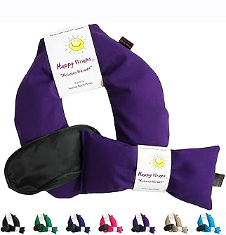 The Happy Wraps® neck wrap, ASIN B00WXEF4F2 on Amazon.com®, made of 100% cotton comes in many upbeat colors to match all your outfits. Men can use the wrap as well and match the colors to their shirts or sweaters. You will also receive a free sleep mask to put over your eyes that is 7.25-inches x 3.5-inches and has 2 elastic straps on the back. The neck wrap is 4-inches wide all the way around and from the center top to the end of each end is 12-inches. The eye pillow is 4-inches x 8.5-inches long and filled with lavender. The wrap has been made in the USA since 1991.