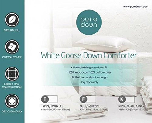 The queen-full size is 90- x 90-inches and is available in twin and king sizes. The goose down is filled with sterilized 75% goose down and 25% goose down feathers without quills or spines. The best-selling comforter on Amazon.com® is super fluffy never becoming flat.