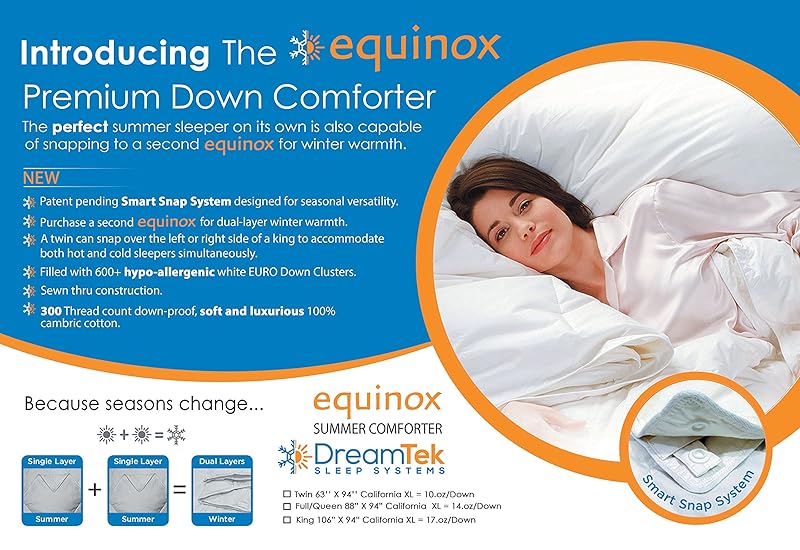 The DreamTek model 5945795 comforter is a 2-layer king measuring 106- x 94-inches for a California long down comforter with a cool Smart Snap System. As a single comforter for summer, it is great; however, the smart thing is you can attach with snaps an identical comforter to it for a warmer winter weight. This is certainly a creative design for one of the best-selling comforters on Amazon.Com®. It has 600+ fill power (FP).