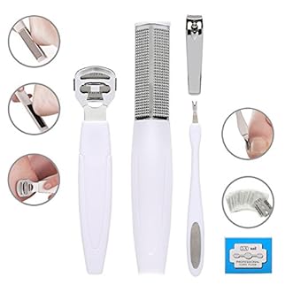 The TC Joy set gives you 5 different tools for removing calluses, trimming your toe cuticle, and trimming the nails on your toes (fingernails too!). It also has a shaver and file for those thick tough calluses. The rasp/file is made of surgical grade stainless steel to hang in the shower. The shaver tool comes with 10 extra blades and it’s the perfect pedicure set for home use and for professional foot spas. This unit is not electric.