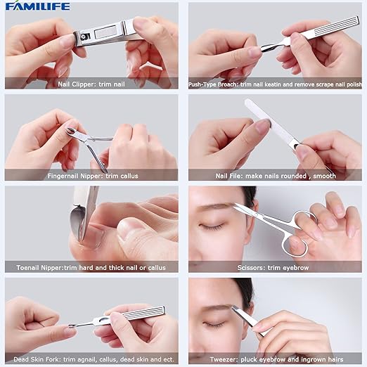 The 11-piece set comes in a rich dark purple zippered faux leather carrying case embossed with FAMILIFE on the front. It is perfect for both women and men. Tools are made of 100% stainless-steel plus zinc alloy.