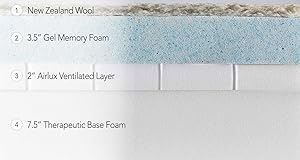 The top layer is New Zealand wool. The 3.5-inches of gel memory foam contours to your body’s shape for impressive pressure relief and correct alignment of your spine. You and your partner will stop the endless all-night tossing and turning. This mattress has movement transfer that other mattresses might not have. The ventilated layer is 2-inches of Airlux for the mattress to breath, and the therapeutic base foam is 7.5-inches thick to absorb your weight and quiet noise when moving.