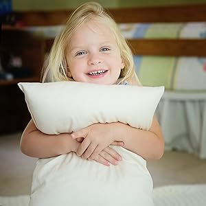 This is the pillow toddlers love to hug. It is 100% certified USA organic cotton using no pesticides fungicides, herbicides, GMOs, (genetic modified organisms) and no flame retardants to grow the cotton shell. The pillow is latex-, phthalate-, lead-, vinyl-, PVC-, and BPA-free. The filling is hypoallergenic polyester fibers and resists dust mites. The covering is 200 thread count to wear longer. The pillow covering is easy to slip on with no zippers or hard buttons. You can buy an extra pillowcase to go over the colorful blue covering on Amazon.com® here.