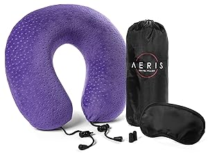 The Aeris travel pillow is for your neck, has toggles that adjust, and comes with a sleep mask and earplugs. It comes in black, blue, olive green, and purple with its velour outer cover and a carrying pouch. The black color NP001Black is a top seller on Amazon.com®. This pillow is model number NP001PiscesPurple.