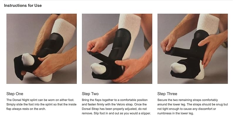 The night splint is lightweight and has 3 padded straps with buckles to adjust to the angle you find most helpful. The foam is soft, breathes, and stays cool to your foot with or without socks. Sleeping with it on at night keeps your ankle neutrally positioned passively stretching the plantar fascia and calf muscles while you sleep. The area will heal over time and most people heal within 3-months or sooner. If your pain persists, be sure to see your doctor.